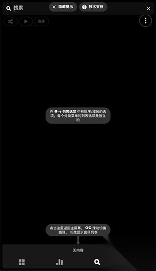 1、这里是Poweramp的主界面,你可以在这里完成滑动切换曲目、滑动更多次切换分类等操作,你还可以通过滑动或者点击来显示当前分类。