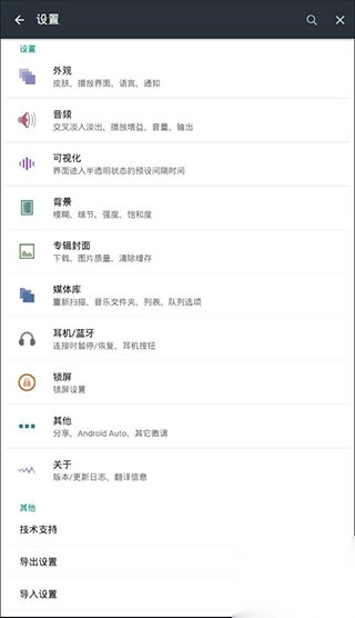 5、在设置页面,你可以进行软件的自定义设置,例如外观、音频、可视化、背景、专辑封面、媒体库、耳机/蓝牙、锁屏等。