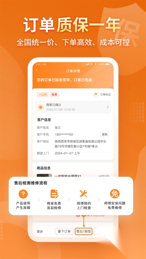 这款家居服务平台自主研发的订单处理系统,能对每一笔订单的来源、去向、完成程度等信息进行严格跟进,为交易安全保驾护航。同时,平台内师傅全天待命,无论用户何时下单,遇到何种难题,平台都能以最快的响应速度为用户服务。