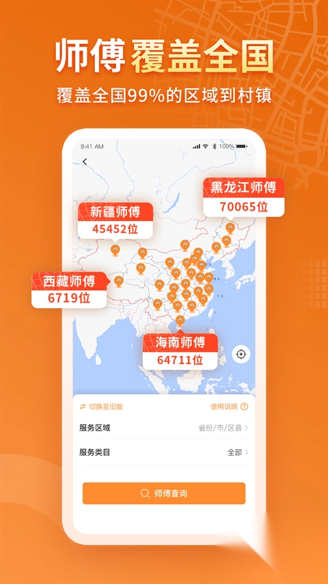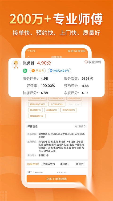 该软件的师傅均经过大数据海选,筛选出的师傅团队具备专业资质认证,技术精湛且服务规范高标准。此外,软件基于LBS及大数据智能服务实现精准匹配,全面解决乡镇市场服务落地问题。