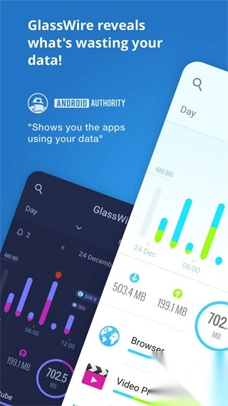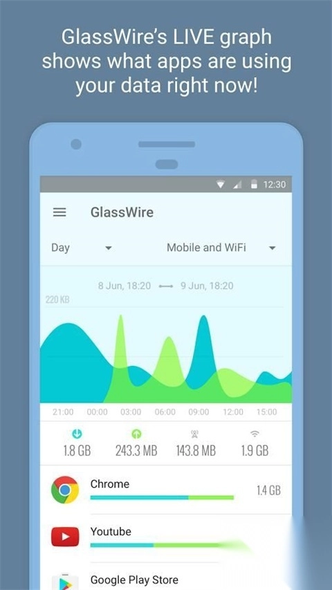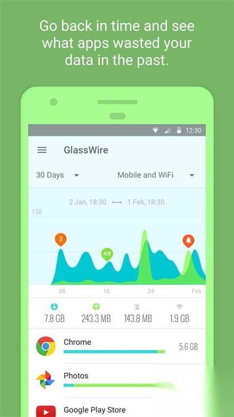 GlassWire手机版是一款可实时监测您移动数据使用状况、数据限制以及具备WiFi手机防火墙功能的软件。借助它,你能知晓哪些应用在消耗你的流量,哪些应用行为异常,哪些应用拖慢网速,哪些应用致使你超出运营商的流量限制。