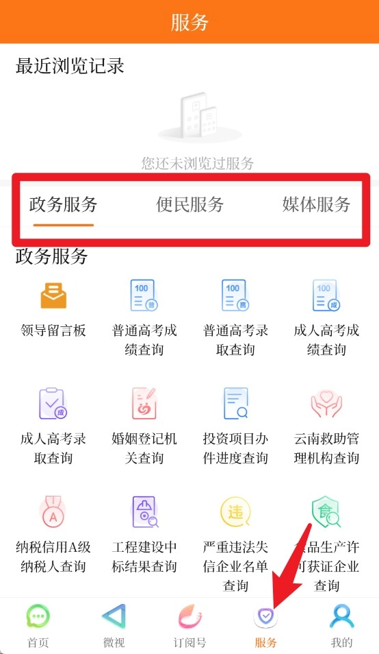 4.点击“服务”可进入政务、便民、媒体服务区,进行办事与查询。