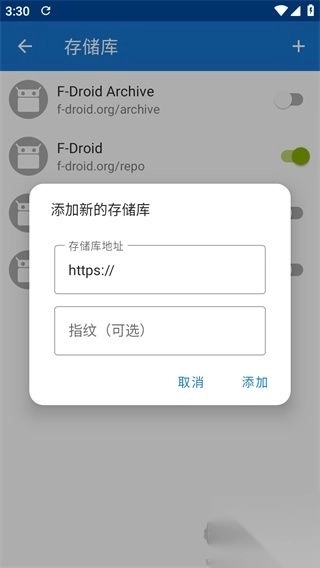 3、复制清华镜像存储库地址https://mirrors.tuna.tsinghua.edu.cn/help/fdroid/到输入框,点击 “添加”。