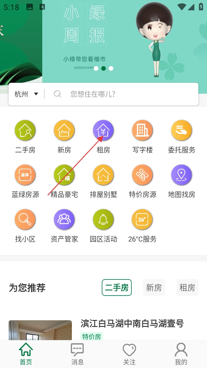 1、打开绿城置换,在首页选【租房】,进入租房列表页。