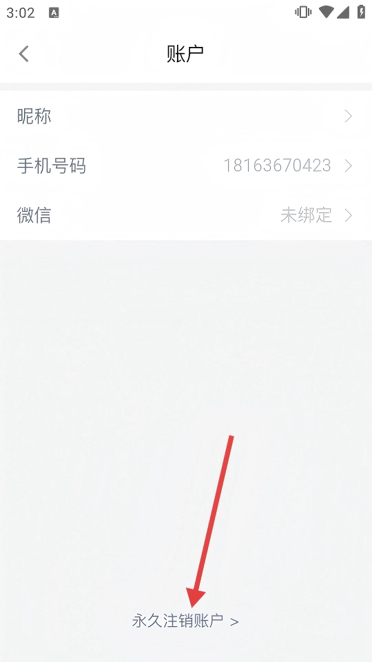 3、进入【账户】页面,下滑找到【永久注销账户】选项,启动账号注销流程。