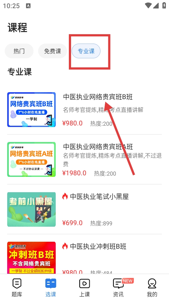 2、在选课页面,切换至【专业课】分类,选择【中医执业网络贵宾班B班】课程。