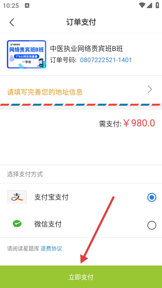 4、在订单支付页面,完善地址信息,选择支付方式,点击【立即支付】完成课程购买。