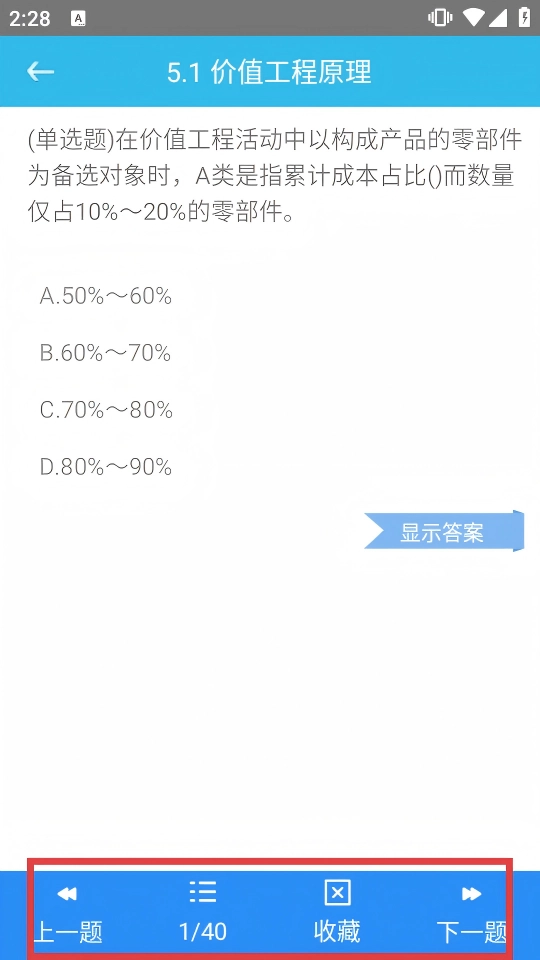 4、做题时借助【上一题】【收藏】【下一题】功能,配合【显示答案】,高效突破价值工程管理小节题目。