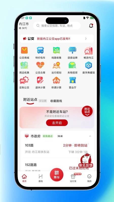 1、在内江公交APP首页,就能查看附近公交站点,便于出行去等车;