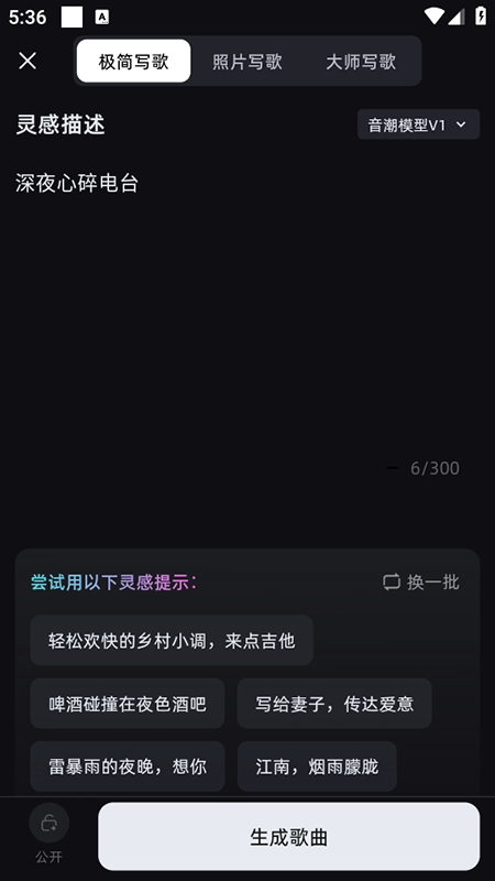 3、然后输入灵感,上方还提供多种不同生成方式,选择后即可一键生成歌曲。