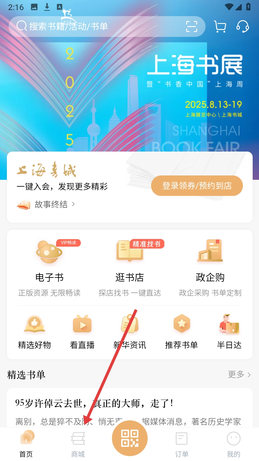 1、打开上海书城,点击底部【商城】,进入线上书城选购图书商品。