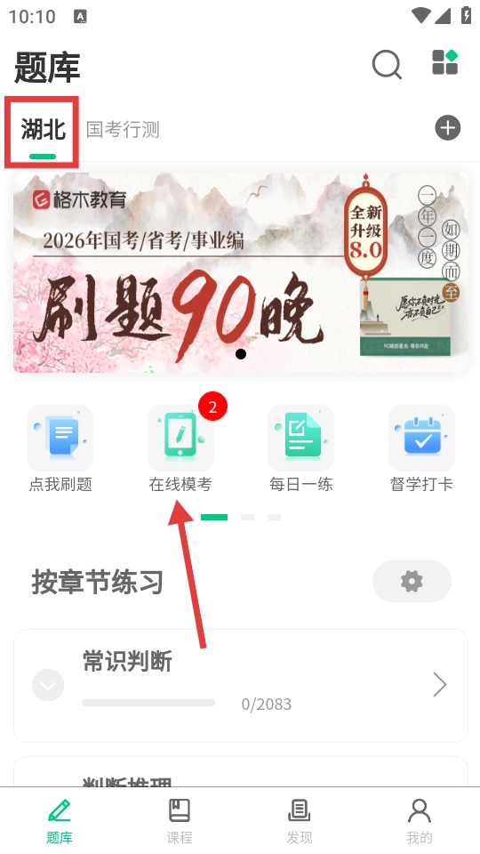 1、打开app,在【题库】页面,点击页面中的【在线模考】。