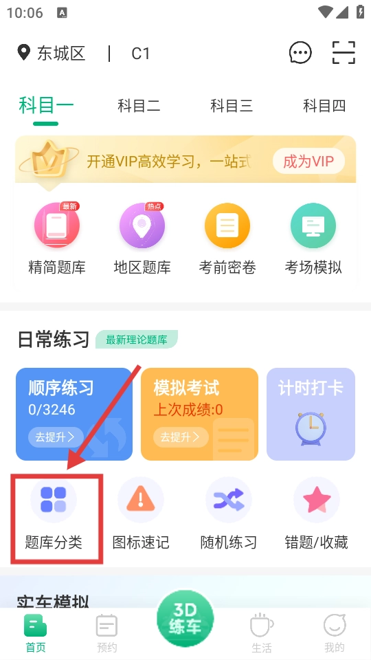 2、在科目一界面,点【题库分类】,展开专项练习目录。