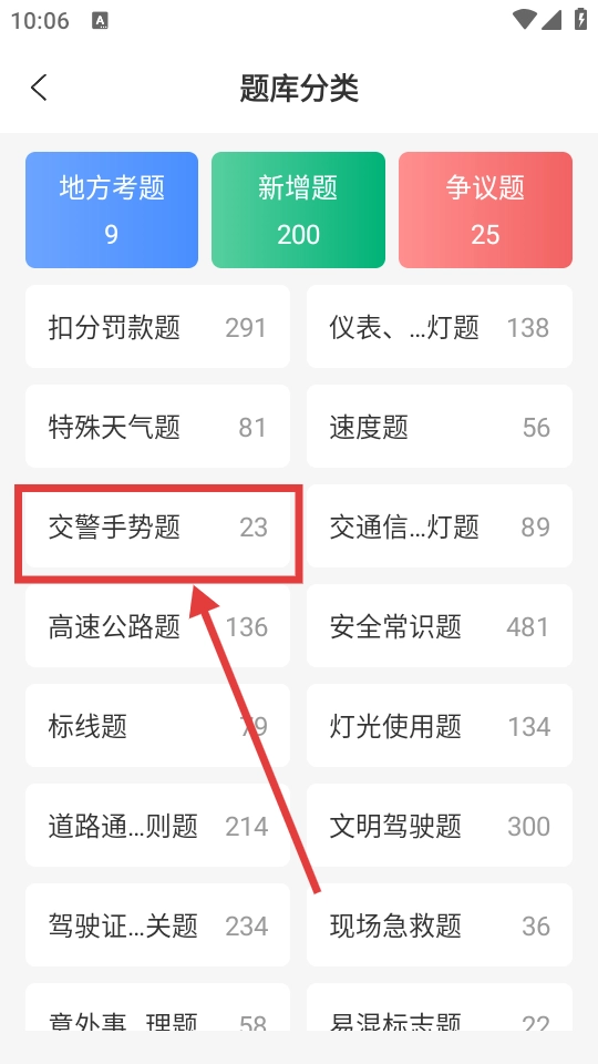 3、接着在题库分类里,选择【交警手势题】,进入该题型练习。