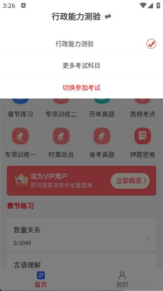 3. 点击页面上方行政能力测验旁的图标,即可选择更多考试科目,或是切换参加考试;