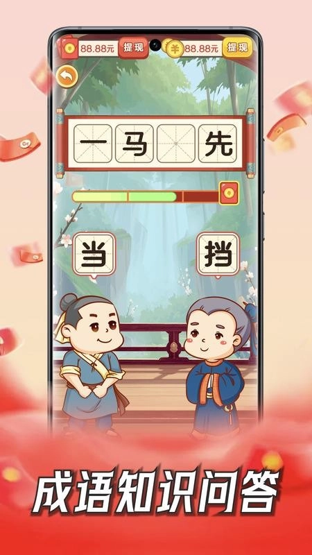 想通过答成语赚钱吗?成语赚钱王APP就能满足你!这款软件操作便捷,一键开启成语知识答题模式,让你尽情施展知识才华。面对展示的残缺成语,只需选出正确文字,就能快速通关,轻松收获丰厚红包奖励,零花钱赚不停。