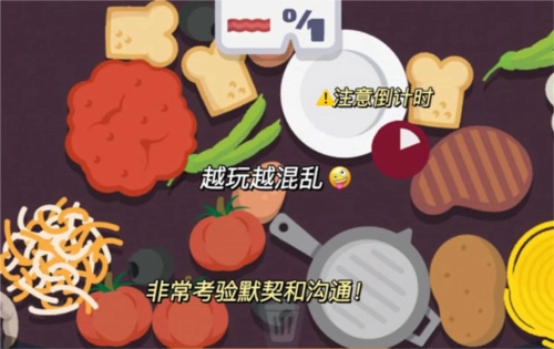 3、随着游戏进程推进,菜品数量会不断增加,你的桌面会变得杂乱无章,寻找特定菜品的难度也会逐步加大。不过,只要队友间配合得足够默契,依旧可以迅速通关。