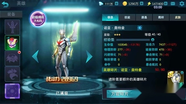 胜利奥特曼:新角色总是很强的,而且参与专属副本就可以得到碎片,每天抽时间打打即可,在用钻石买了皮肤之后所有技能都会进行变化,可以说是非常强力的。