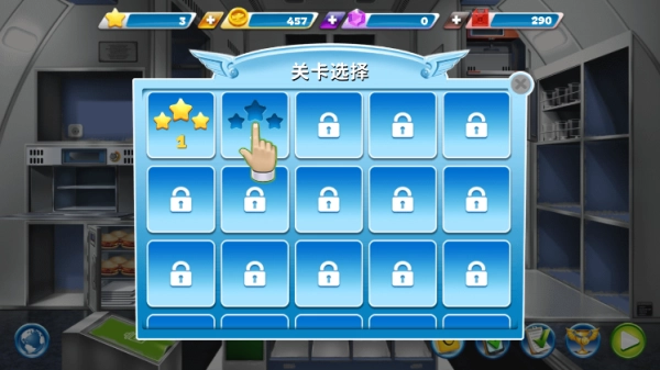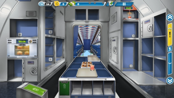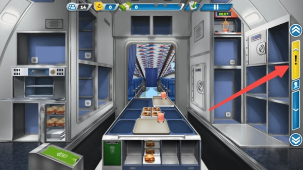 5、点击右侧箭头,即可前往机舱或者返回飞机厨房。在机舱里,需将顾客所需食物递给顾客。