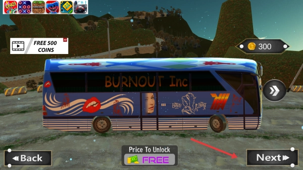 1、在巴士选择页,点【Next】选“BURNOUTInc”涂装巴士,用FREE解锁。