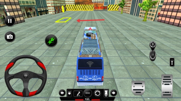 3、在城市场景,控巴士方向盘、油门,按箭头找黄色区域,完成停车任务。