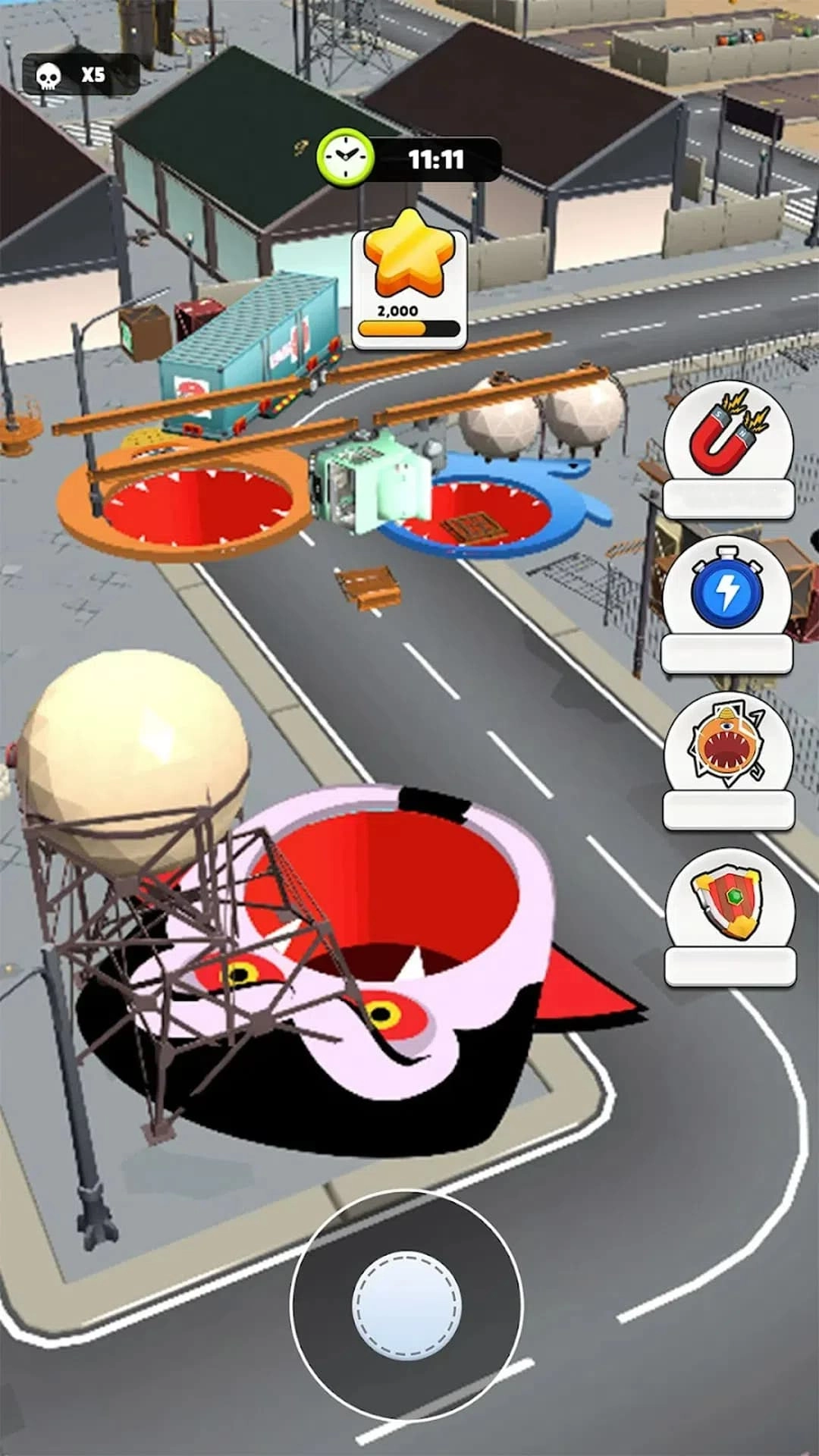 3、借助虚拟摇杆来控制角色移动,于场景里寻觅并吞噬诸如车辆、建筑、箱子之类的物体。
