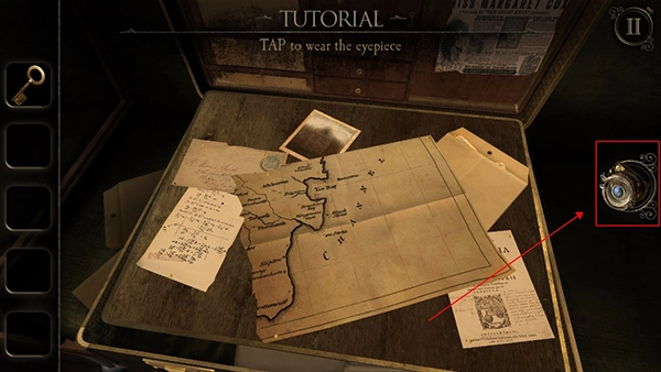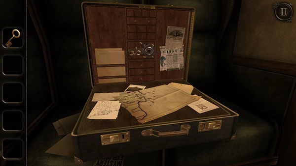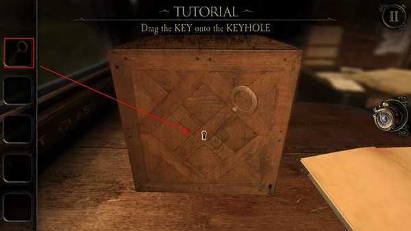 2、第一个场景设定在车厢之中,玩家首先要查看桌子上的日记本。随后,火车会开进一段黑暗的隧道。在这之后,桌子上会出现一个木盒子,通过双击操作靠近木盒子,即可拾取一把钥匙。