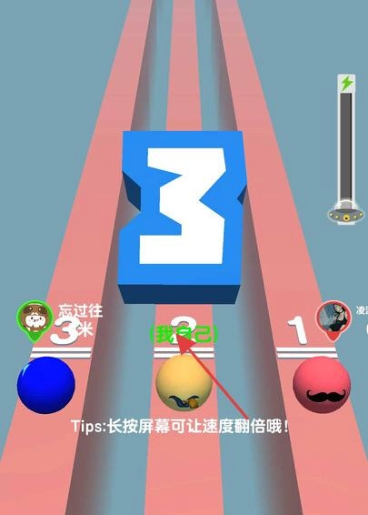 2、跑道场景,操控黄色球球(自己),长按屏幕加速,避开障碍,和其他玩家球球竞速。