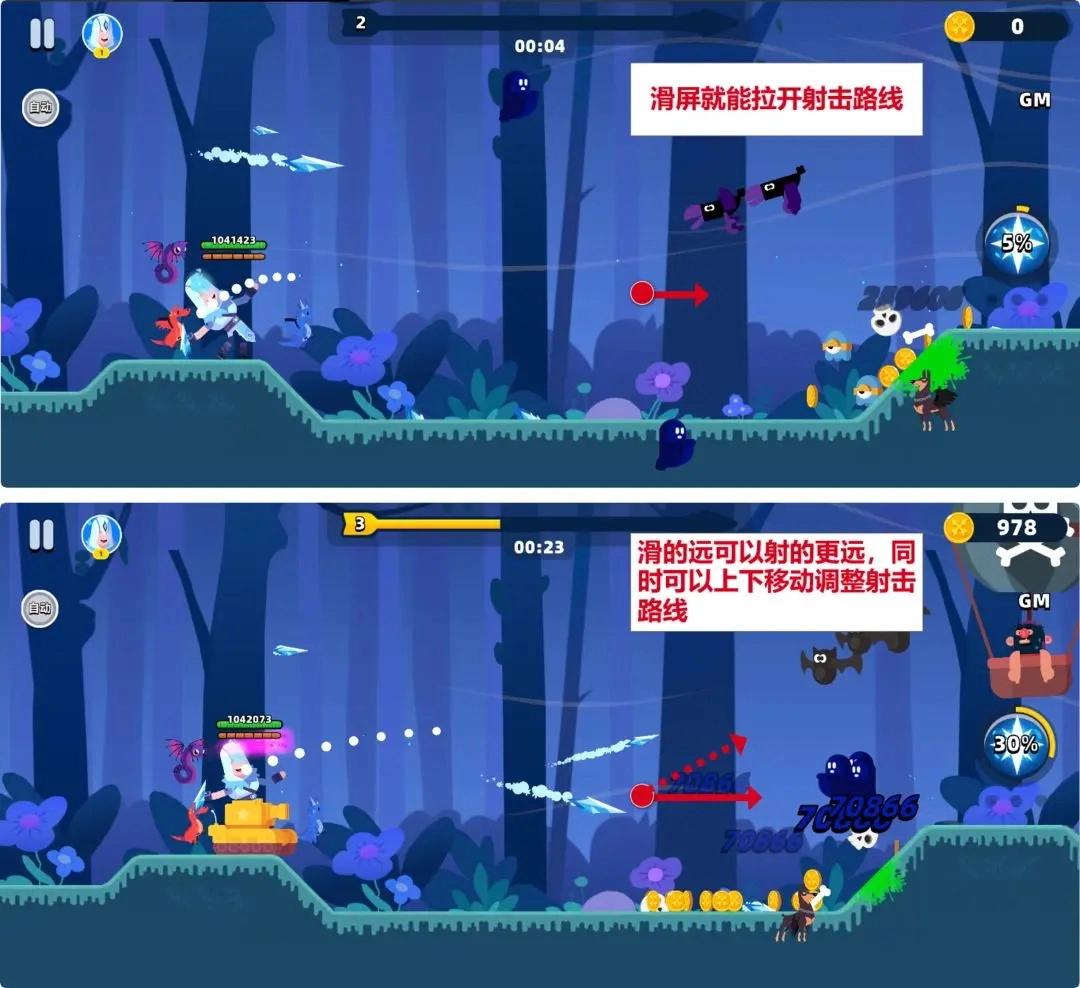 仅需滑动进行瞄准,松手即可射击!箭矢将按抛物线轨迹飞行,通过上下滑动能够调整飞行路线。解锁长按技能后,长按便能蓄力,从而获取额外攻击效果。