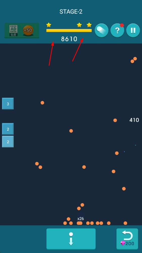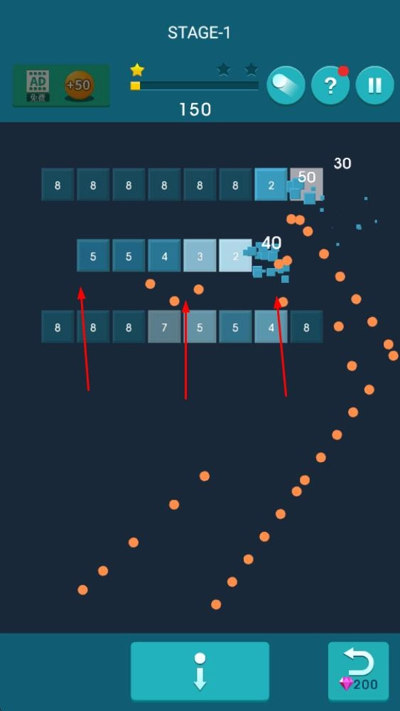 1. 瞄准角度发射小球:留意屏幕下方方块的布局,据此调整发射角度,并预判小球的弹射轨迹。待确定最佳角度后,再发射小球,力求通过反弹让小球撞击到目标方块。刚开始时,不妨多尝试几次以进行角度调整。