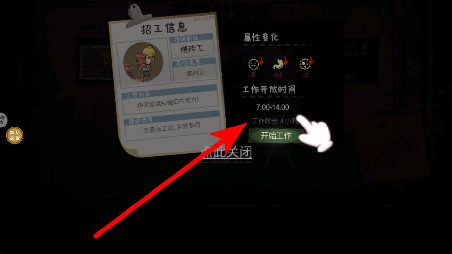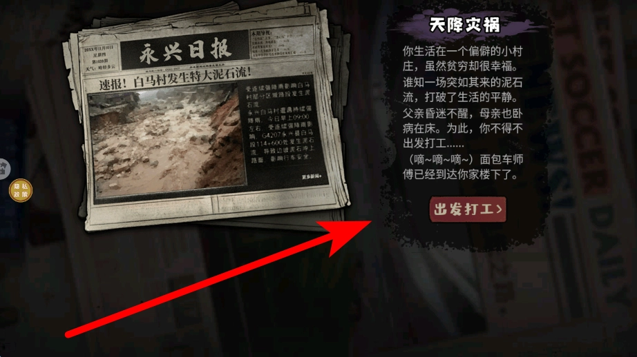 1、当玩家准备出发打工时,只需点击“出发打工”按钮,就能开启打工之旅。此时,玩家会离开原本所在的场景,前往与打工相关的地点,进而开启后续找工作以及工作等一系列流程。