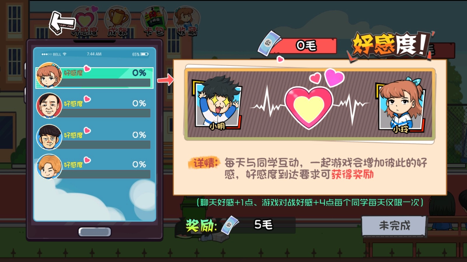 3、每日和同学进行互动,共同参与各类活动,能够增进彼此的好感度。(当好感度达到特定程度时,玩家便会解锁奖励)