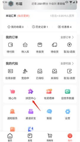 1. 于“我的”界面里寻觅到拼团中心,并展开访问。