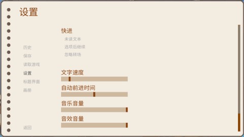 6、在游戏设置里,还能够对文字速度、音乐、音效等选项进行调整。