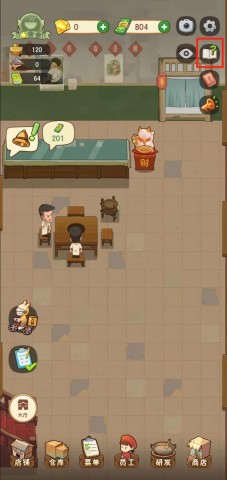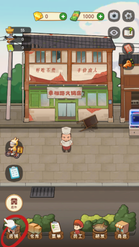 2、既然你已接手这家火锅店,首要任务是让店铺呈现全新面貌。点击左下角的【店铺】,进入清扫模式,我们要将排队区清扫整洁。