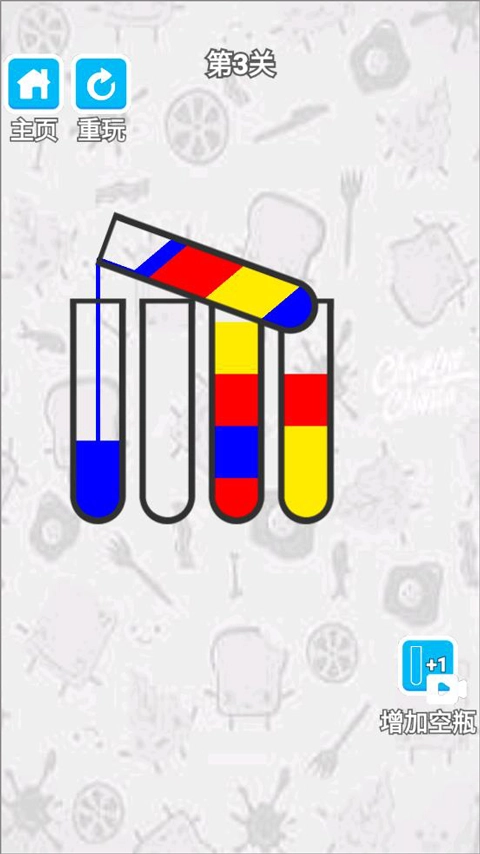 3、当同种颜色的液体将瓶子完全倒满时,就能通关,通关后可获取金币奖励。