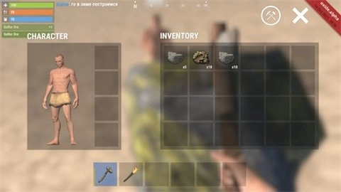 2、着手收集各类材料并制作工具,首要任务是打造斧头与镐,借助它们来收集一些更为高级的材料。