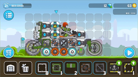 3、持续通过新手关卡来刷钱,涡轮发动机至少得有一个,粘性车轮有两个即可,骷髅车架购买四个,蓄电池购置一个。