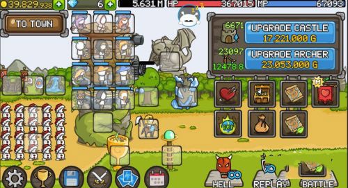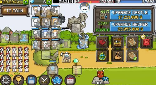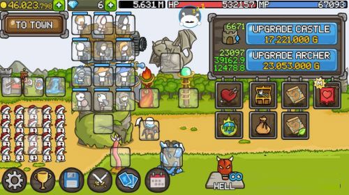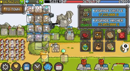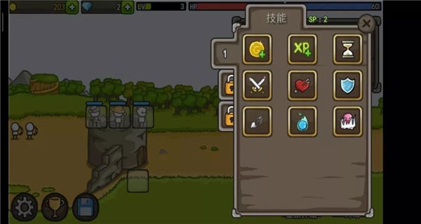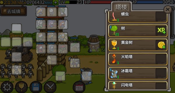 城堡的塔楼能够进行成长与升级,每一层都能够用来放置英雄。随着拥有金钱数量的增多,便能购买更多的英雄以及装备武器。