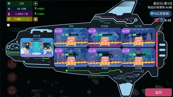 其次的话注意主舰一定要升级,别因为运输不够就只升货仓和运输仓(其实后面我的运输基本上都是空出来,原因上面提到过,我不屯那些货,所以不用再各个星系来回运输,基本只要运输市场的就行)。我觉得生产仓和科技仓是最重要的!生产仓决定了你在市场能不能做那些来钱快的商品,科技仓不够你任务不好做,材料也不好来。像我刚开始不升生活仓与住宿仓导致等级不够,后来花了好多钻石才跟上进度(为了满足我的强迫症)。