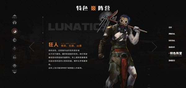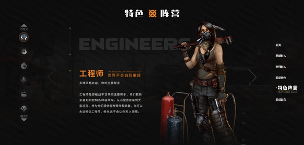 3、阵营:不同阵营将有不同的发展方向和特色,在对战匹配中,面对不同阵营可有多种战术。工程师是初始阵营,随着等级提升,可加入其他阵营,狂人阵营为近战,游民阵营有飞机部件,拾荒者和野战军属于远攻型