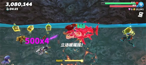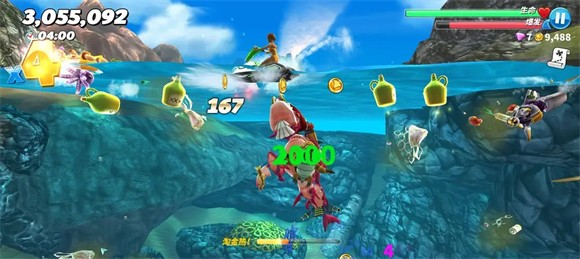 3、建议使用赠送的狂暴鲨群来刷钱,不然最右侧的洞穴将无法进入。另外,攒下的钱尽量不要随意花费,钻石优先用来购买火箭包,金币则优先攒起来以解锁顶级鲨鱼。