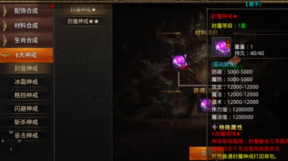 【神戒】包含以下6种类型:封魔、冰霜、格挡、闪避、斩杀、暴击,这些神戒具备各类buff与debuff效果。