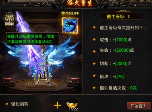 浴火重生不但能够提升倍攻属性,并且每提升30次便会额外增加1次复活次数。