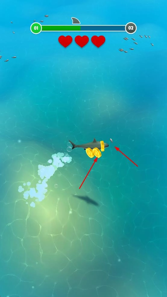 2. 在深海场景之中,操控鲨鱼去收集金币和小鱼,在此过程中要时刻留意血量,以此为提升等级打下基础。