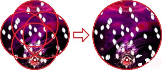 3、当观察那些自机左右两边空隙数量看似较为对称的弹幕时,实际上我所看到的左右两边空隙数量并不对称。在避弹过程中,若遭遇正面落下的弹幕,可能出现封位情况,此时就需要扩大“视野”,紧急寻找远处的出路。这种情况下,视觉焦点必然会偏向左边或右边其中一侧移动,而非在左右两边平均分配。如此一来,我向某一边躲闪的次数就会多于向另一边躲闪的次数。明明左右两边观察到的空隙数量都不少,为什么不尝试将视觉焦点平均分配呢?