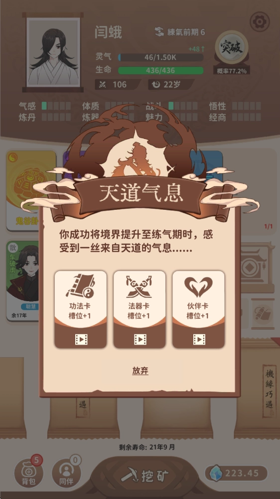 6、在突破进程里,还会随机引发各类事件,像此处的天道气息便是如此。