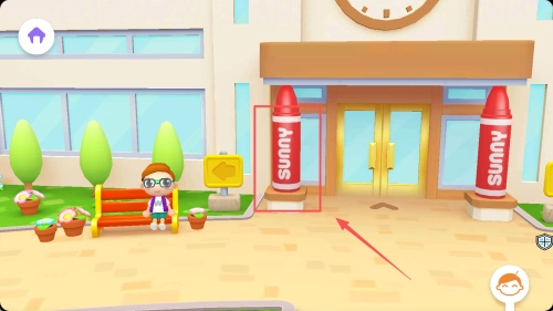4、注意场景里的紫色屋顶建筑以及黄色指示牌,顺着箭头所指方向前行,去探索并解锁新的校园区域。