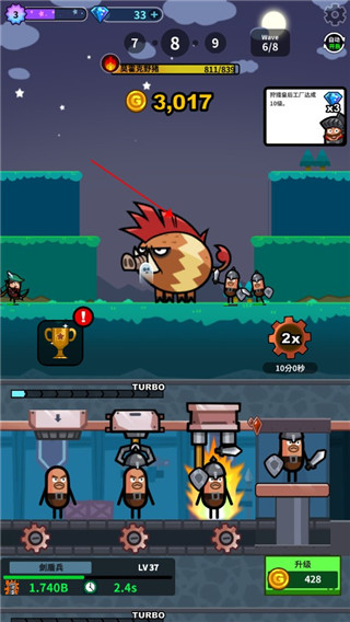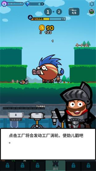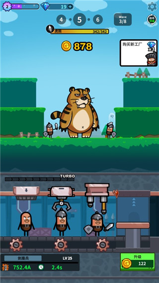 5、唯有解锁更多兵种,你方可对boss造成更高伤害。工厂会循序渐进地将小人转化为你心仪的士兵。