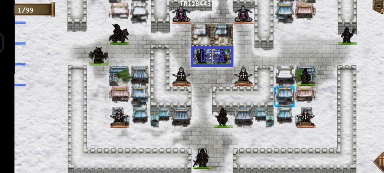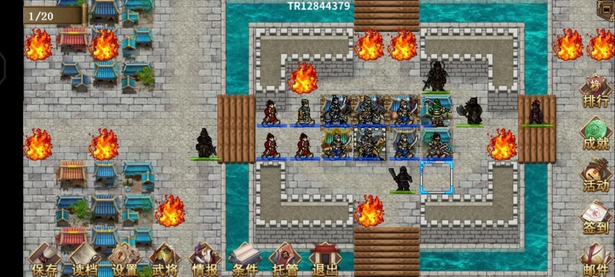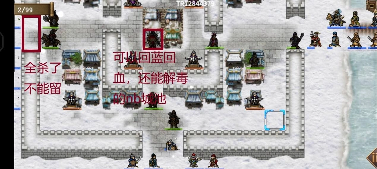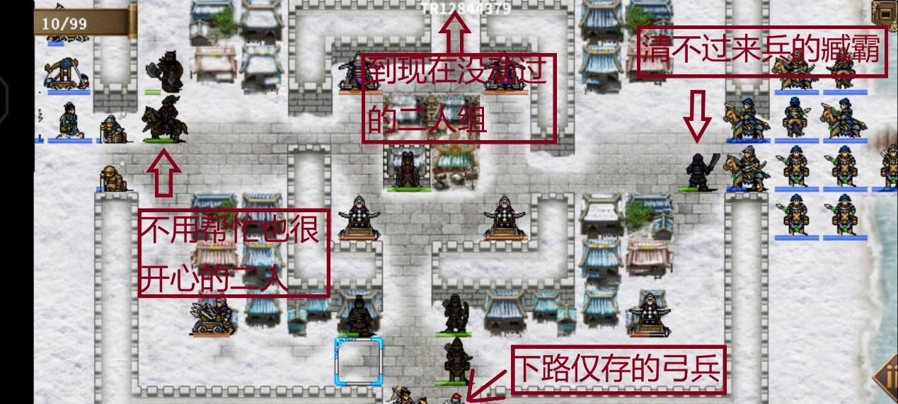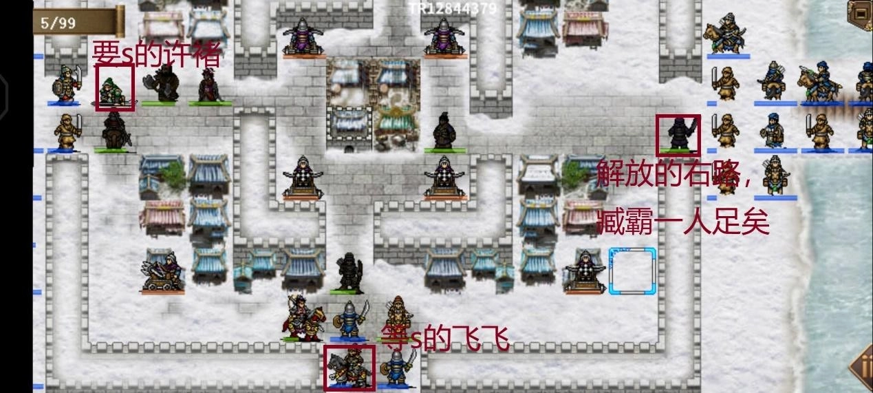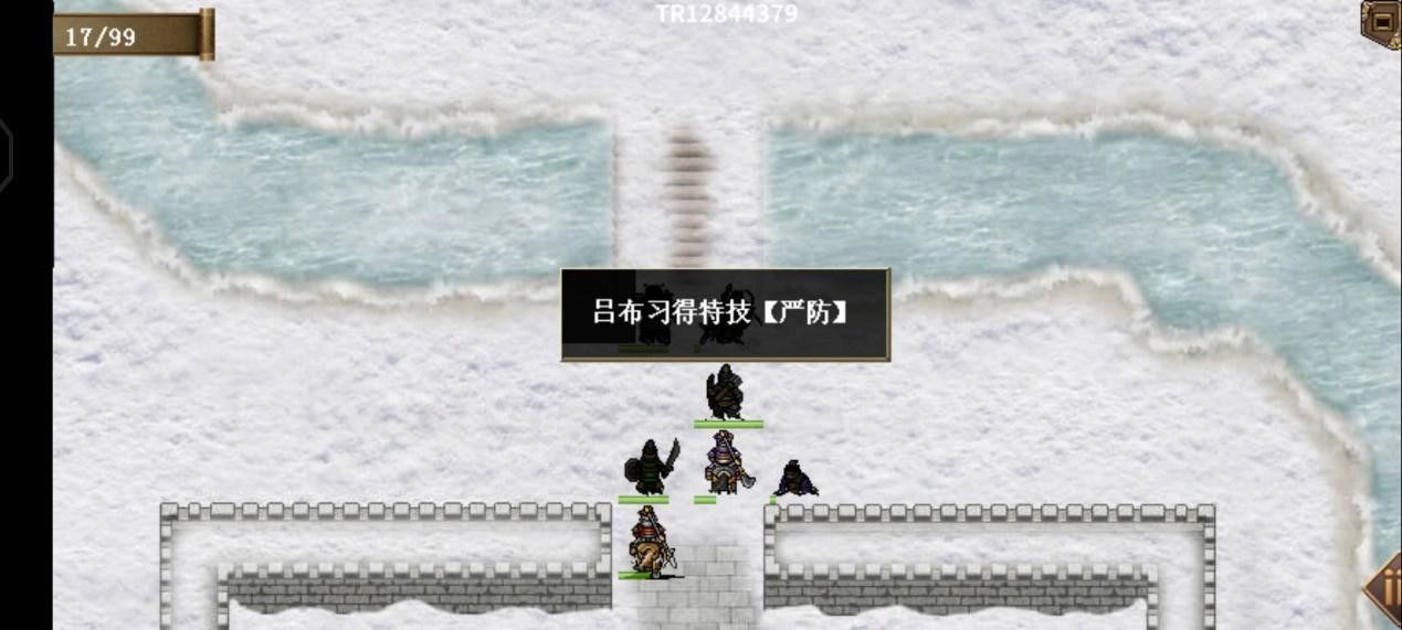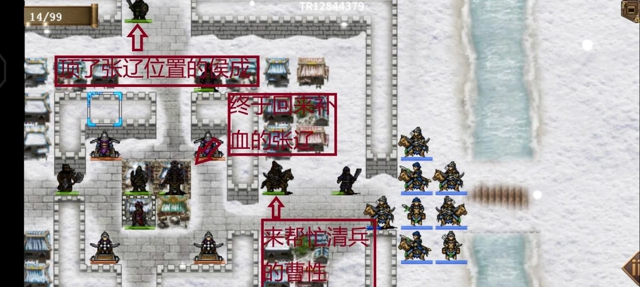 其他:左侧的道士可以给臧霸或者高顺带上孟德新书骗技能(谁智力低给谁)。第四回合给吕布加强行,第八回合左右就可以重新加入战场。敌军武术家移动比策士快,策士会脱节很严重,继续往城里打就行,敌军会翻山越岭,一个个来送。